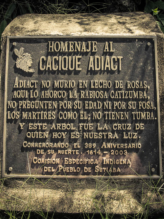 This plaque on the base of the tree is a remembrance to the brave leader of the Chorotega people. Calle de la Ronda, which marks the border between Leon and native Sultiava, has a park, Parque Adiact, dedicated to this brave leader and his daughter, Xochitl Asalt. She is said to have committed suicide when she learned of her father's death when she returned home from a mission.