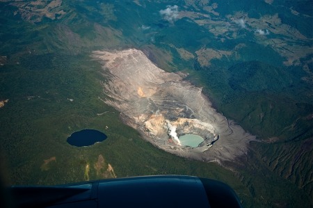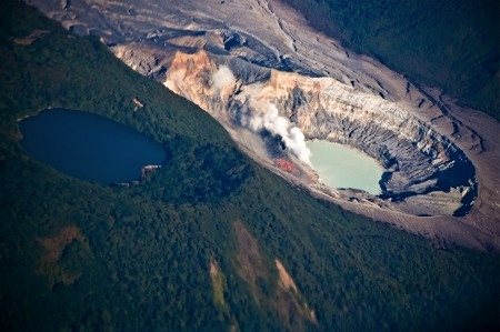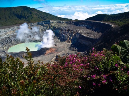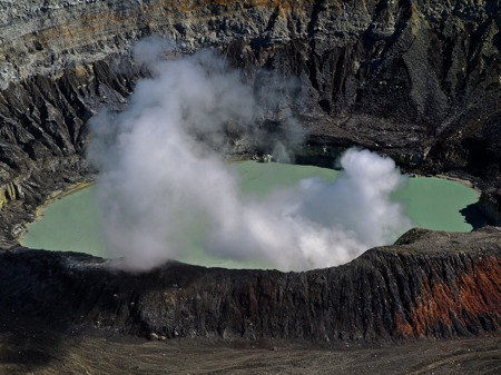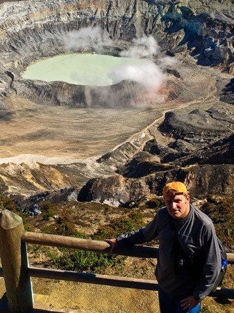 Poas is not the highest or the most active of Costa Rica's volcanoes but it is the only one with two craters-one active and one filled with a cold water lake surrounded by a dense jungle. The main crater holds the only place where a lake of liquid sulfur can be found and boiling sulphurous gases spew regularly from the steam vents surrounding the crater. Poas also allows the viewer to get right up to the crater, driving up to 600m. from the rim and walking up to the edge. The main crater is found at an elevation of 2708 m., measures 1.5 km across with the inner crater lagoon measuring 400 m. in diameter. Occasionally the emissions of sulphur gas reaches amounts that closes the park for a short time. Obviously the day we were there the levels weren't that high but when a gust of wind blew by the distinctive ordour made you aware of it's presence.