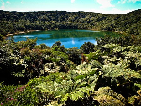 Vegetation surrounding Poas has been stunted or totally destroyed in places but you can see shades of green on the lava flows where plant life once again is springing forth. Walking through the dwarf forest to the crater holding Lake Botos is a fascinating experience. It is dense and jungle like, moss growing and covering everything. Tough ferns and bonsai type trees are kept stunted due to the acid rain. The air is noticeably cool but not too far overhead you can see the sun as most of the trees are no more than 20'. Tropical plants and flowers cover the forest floor and animal life can be heard but hard to see. Coming into the clearing at the end of the trail reveals beautiful Lake Botos, emerald green in colour and quite surreal. Pictures really do not do sights like this justice!!