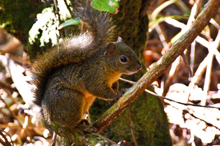 As we continued on the trail after viewing Lake Botos (the highest elevation of the park) we found these little fellows scurrying around on the dense jungle underbrush. This one stopped long enough for Rob to take his picture, he almost seemed to pose. These "mountain squirrels" are identifiable by their greenish-yellow colour with a tail always as least as long as their body. Also notice the small short ears which set them apart from the similar but more populous red squirrel.