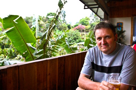 We sat by the open air windows over-looking the gorge below. It was a nice view and we could see the storm moving in and listen to the thunder getting closer. The temperature took a definite drop and then the clouds opened up and it POURED, straight down, no wind. You can imagine the sound as the restaurant had a steel roof (with one major leak) and no windows to block out the roar of the rain. It was awesome!!!! We are so glad we stopped and of course had to wait till it eased to go wait for the bus so had time for a second Imperial. Check out video section for more sights and sounds of our first rain here in Costa Rica ( http://asifweknow.com/index.php?pg=5&vid=6 ) .