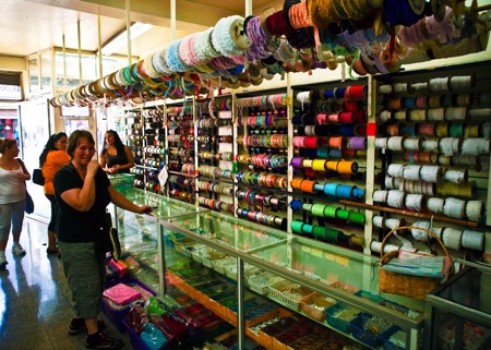 Shortly after we arrived I realize I had left some of my supplies for embroidery at home. As we were walking up the street from the bus station in Alajuela I couldn't believe my eyes, a store full of ribbons, yarn, zippers, beads. The colours were amazing. And of course there was "embroidery floss". How easy was that!! Rob let me go in and get some but he limited my time. Later that morning we found two sewing machine stores, one Janome, one Singer. You're never far from what you need.