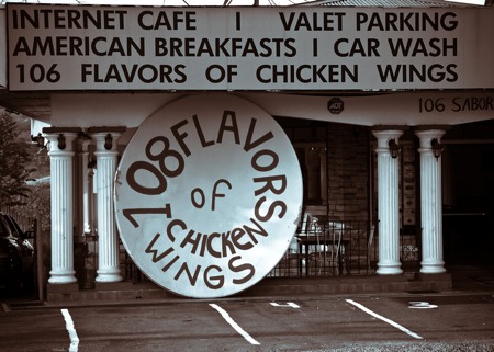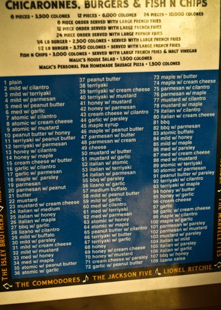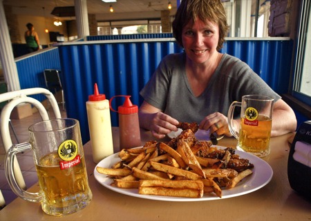 If you really want the taste of home or are just a little homesick there is nothing like chicken wings and pool tables to cure you. Large screen TV's with ESPN on doesn't hurt either. About 1 km. back towards the Pan-AM highway is Magic Motown, an American owned bar and restaurant serving roadhouse type food. Prices of food are comparable to home-c3500 or about $7 for 1 lb.- but the wings are large and meaty and where up home do we get 108 flavours!!!! They are also served with large fresh cut fries. Good thing we had a walk home to wear them off. The real bargain is the 24oz. draft of their local beer, Imperial, for c750 or $1.50.