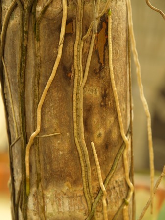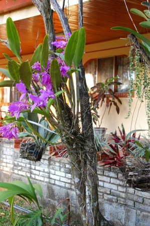 She proceeded to show me how she attaches the orchid plant to the tree trunk with stretched out pieces of nylons. Then the roots sprout and attached themselves to the tree. She has them all over with differing colours and sizes. Very inventive and quite beautiful.