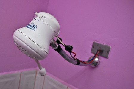 by Anne Watcher on Friday February 22nd, 2008 at 10:56amThis lovely contraption graces our shower and is the only source of hot water in the cabina (unless you boil it on the stove). Essentially it is an on demanded water heater and a smart idea I think although I doubt the open wires even with electrical tape would pass CSA approval. They are found all over Central and South America.